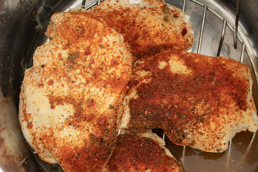 - Añade el caldo de pollo al fondo de la olla instantánea. Añade el pollo y los condimentos deseados. Pon la tapa, sella y cierra la válvula.